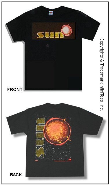 Our Sun design is a detailed hand-illustration of our Sun's surface activity featuring the solar flares. This very carefully drawn image is screenprinted on a 6.1 ounce 100% preshrunk cotton t-shirt. The Sun design is also available on long sleeved t-shirts, sweatshirts, as well as hooded sweatshirts. Customers that are interested in ordering these styles of sportswear should call our Customer Service toll-free at 1-888-702-7876.
