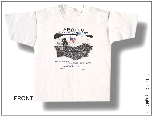 The design is screenprinted on a white 6.1 ounce 100% preshrunk cotton Tee. Our Lunar Landings design