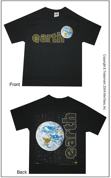 Our Earth design is a detailed hand-illustration of our home, planet Earth. This very carefully drawn image is screenprinted on a 6.1 ounce 100% preshrunk cotton t-shirt. The Earth design is also available on long sleeved t-shirts, sweatshirts, as well as hooded sweatshirts. Customers that are interested in ordering these styles of sportswear should call our Customer Service toll-free at 1-888-702-7876.