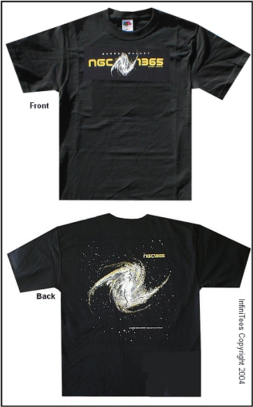 This screen printed Tee is our hand illustrated impression of the NGC1365 Barred Galaxy. The design is front and back on a 6.1oz 100% cotton T-shirt. This design is also available as a long sleeved T-shirt, Sweatshirt or Hooded Sweatshirt with front pockets. For these items please call our customer service number 1-888-881-0387 to order